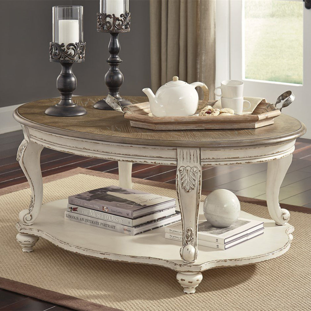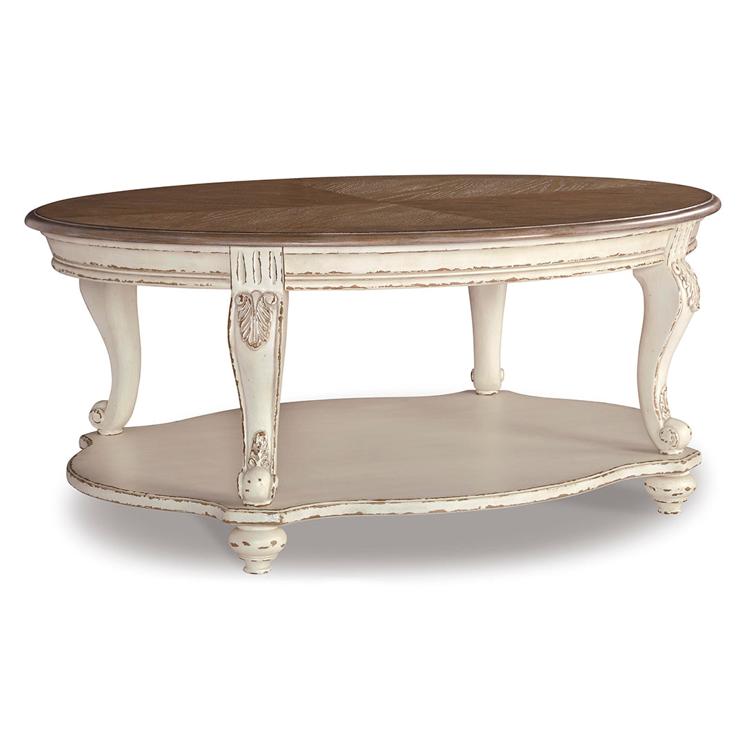 - Geleneksel kır evi stilini bir üst seviyeye taşıyan Realyn oval kahve sehpası, size yıllarca güzel bir şekilde hizmet edeceğinden emin. Eskitilmiş iki tonlu estetiği daha fazla çekicilik için yontulmuş beyazı, eskitilmiş ahşap kaplamalı bir üstle harmanlıyor. Klasik cabriole ayaklar ve biçimli alt raf hoş bir dokunuş sağlar. Dekoratif kornişler zarafet katar.