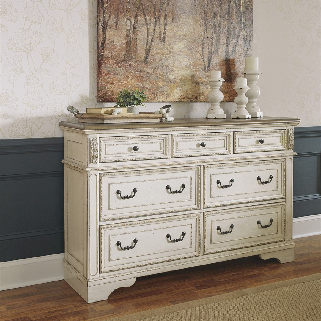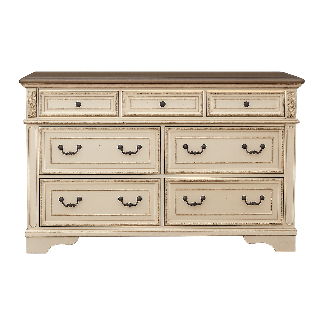 Geleneksel yazlık tarzı sanatını bir üst seviyeye taşıyan bu şifonyer, hayalinizdeki yatak odasının gerçekleşmesini sağlıyor. Antika iki tonlu estetiği, daha fazla çekicilik için yontulmuş beyazı eskitilmiş ahşap kaplamalı üst kısımla harmanlıyor. Çerçeveli çekmece cepheleri ve dekoratif konsollar zarafet katarken, koyu bronz tonlu kefalet çekmeceleri klasik bir dokunuş katıyor.