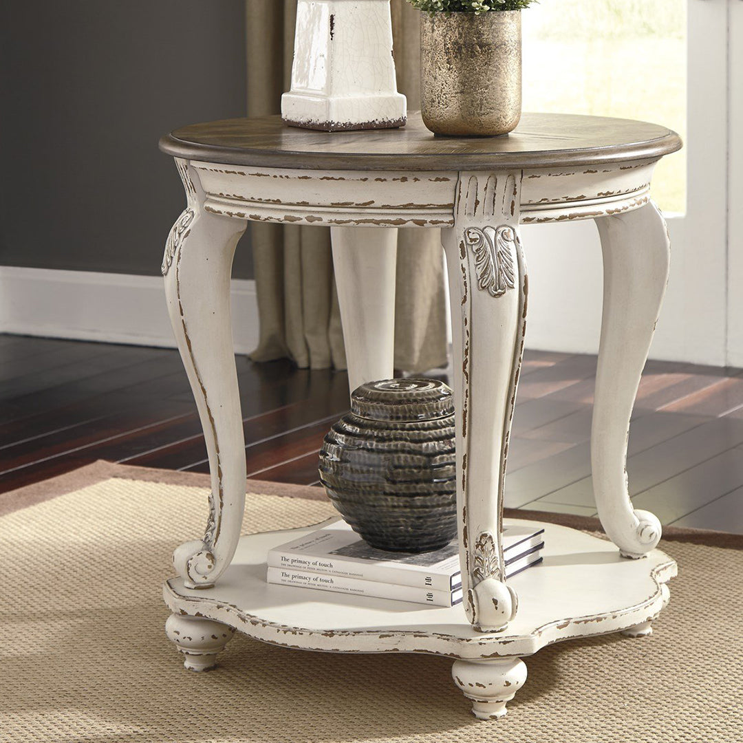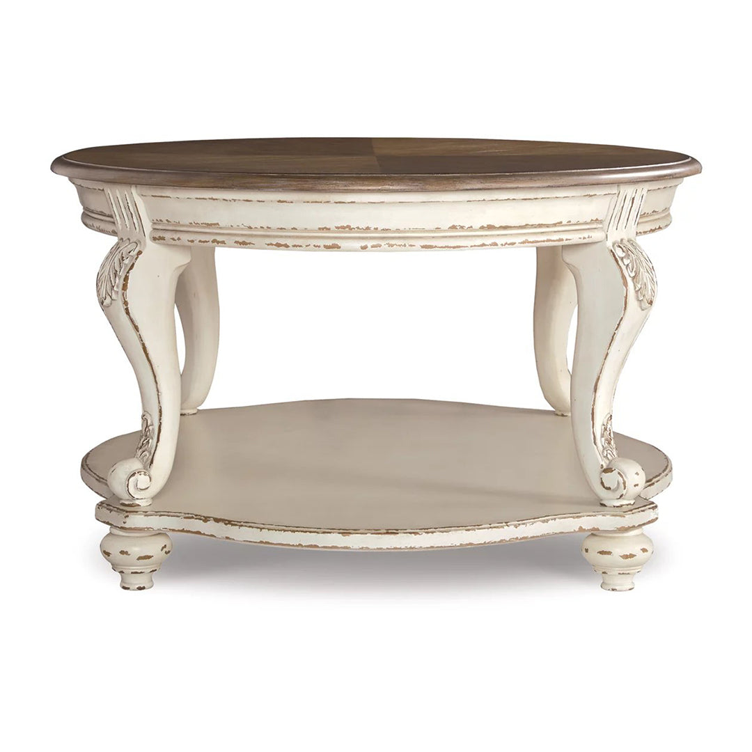 Geleneksel kır evi stilini bir üst seviyeye taşıyan Realyn sehpası, size yıllarca güzel bir şekilde hizmet edeceğinden emin. Eskitilmiş iki tonlu estetiği daha fazla çekicilik için yontulmuş beyazı, eskitilmiş ahşap kaplamalı bir üstle harmanlıyor. Klasik cabriole ayaklar ve biçimli alt raf hoş bir dokunuş sağlar. Dekoratif kornişler zarafet katar.