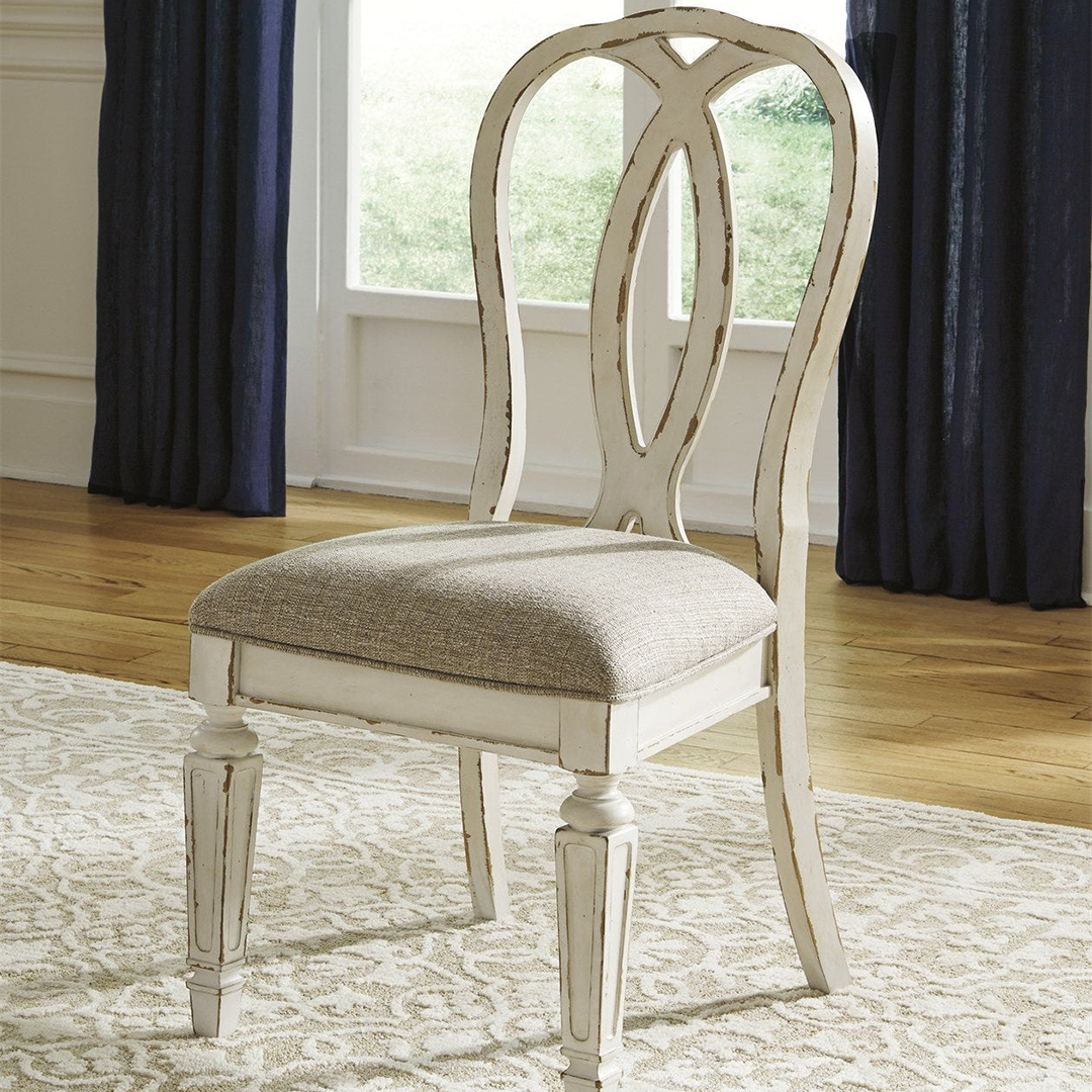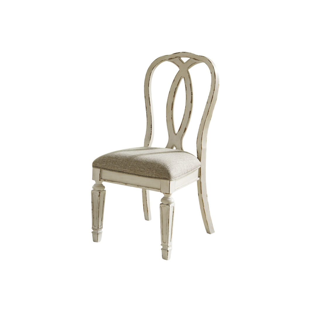 Yuvarlak merdiven sırtlı stili, yontulmuş beyaz kaplaması ve yumuşak minderli oturma yeri ile Realyn yemek odası sandalyesi, Fransız kırsalından ilham alan bir göz ziyafeti için tüm doğru malzemelere sahiptir.